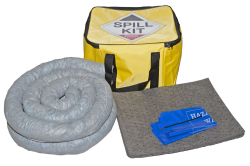 The kit includes absorbent socks to contain spills and protect drains and absorbent pads to soak up spilled liquids. Disposal bag and zip-tie included.