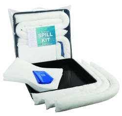The kit includes absorbent socks to contain spills and protect drains and absorbent pads to soak up spilled liquids. Disposal bag and zip-tie included. Instructions for use clearly displayed on exterior label.