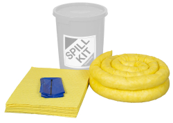 The kit includes absorbent socks to contain spills and protect drains and absorbent pads to soak up spilled liquids. Disposal bag and zip-tie included.