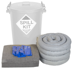 The kit includes absorbent socks to contain spills and protect drains and absorbent pads to soak up spilled liquids. Disposal bag and zip-tie included.