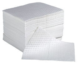 Premium-weight Oil & Fuel absorbent pad. For use on oil, fuel and solvents. Ideal for easy clean-up of everyday spills and leaks. Tough, hard-wearing, fine-fibre finish for use in industrial applications. Central perforation for easy tearing and maximum economy. Water repellent properties enable use in outdoor situations without absorbing rainwater.